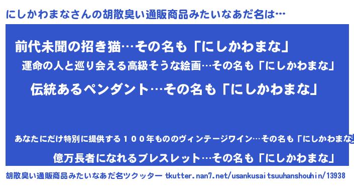 | ヘコむあだ名 | 『にしぷりん』『にしかわまな(笑)』 |