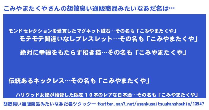 | ヘコむあだ名 | 『こみやまたくや(笑)』『こみっふぃ~』 |