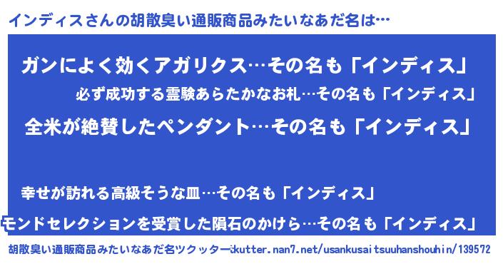 | 意味不明あだ名 | 『とにかく怪しいインディス』 |