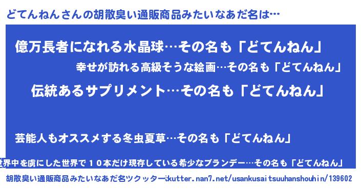 | 男性向けラノベタイトル風あだ名 | 『どてんねんに滅ぼされるだけの簡単なお仕事です』 |