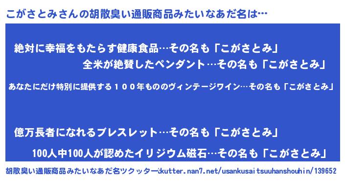 | 意味不明あだ名 | 『住所不定無職こがさとみ(13歳)』 |