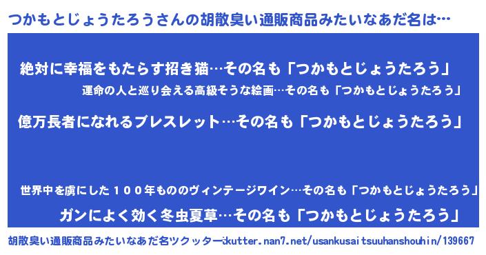 | 男性向けラノベタイトル風あだ名 | 『つかもとじょうたろうに滅ぼされるだけの簡単なお仕事です』 |