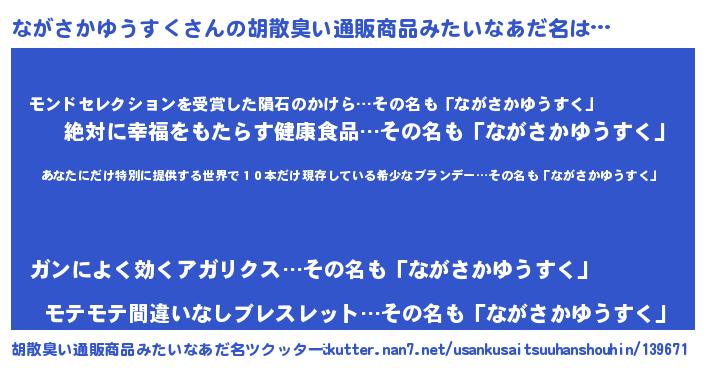| 意味不明あだ名 | 『住所不定無職ながさかゆうすく(71歳)』 |