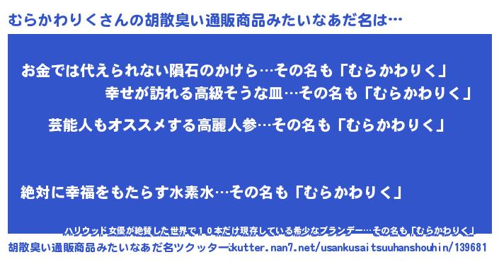 | 意味不明あだ名 | 『自称むらかわりく』 |