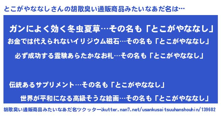 | 男性向けラノベタイトル風あだ名 | 『とこがやななしの憂鬱』 |