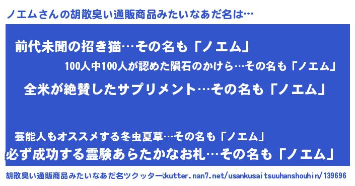 | 男性向けラノベタイトル風あだ名 | 『ノエムの嫁は女の子じゃないと思った?』 |