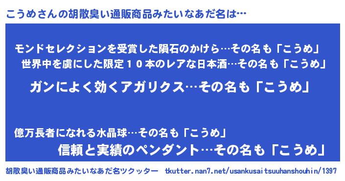 | 意味不明あだ名 | 『自称こうめ』『眠気覚ましガムこうめ味』 |