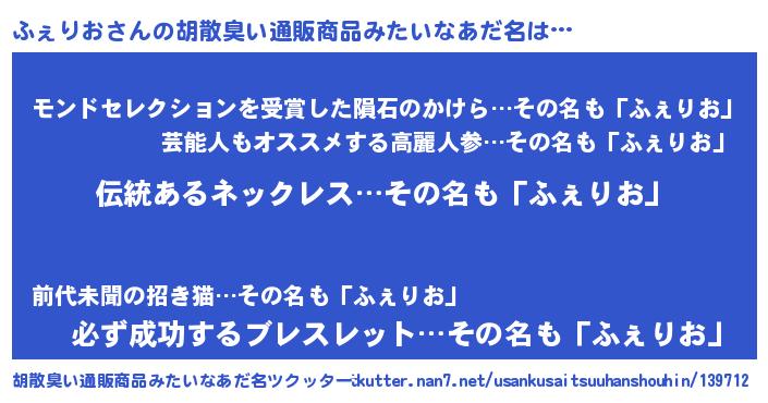 | 男性向けラノベタイトル風あだ名 | 『冴えないふぇりおの育てかた』 |