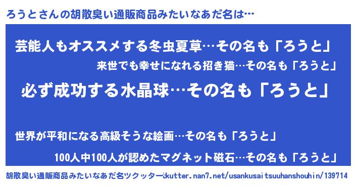 | 意味不明あだ名 | 『ペロリンろうと』『自称ろうと』 |