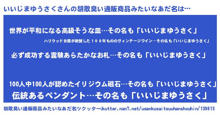 | 男性向けラノベタイトル風あだ名 | 『いいじまゆうさくの憂鬱』 |