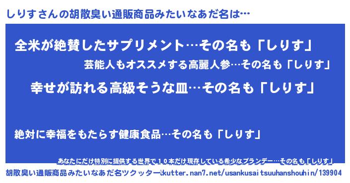 | 女子向けラノベタイトル風あだ名 | 『しりすの雑貨屋さん』 |