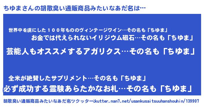| 男性向けラノベタイトル風あだ名 | 『Re:ちゆまから始める異世界生活』 |