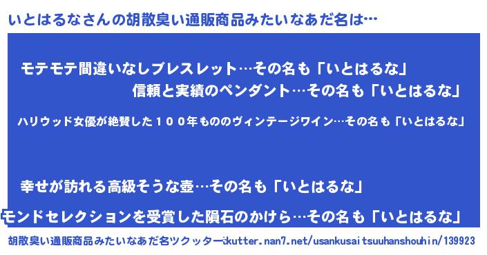 | 意味不明あだ名 | 『住所不定無職いとはるな(11歳)』 |