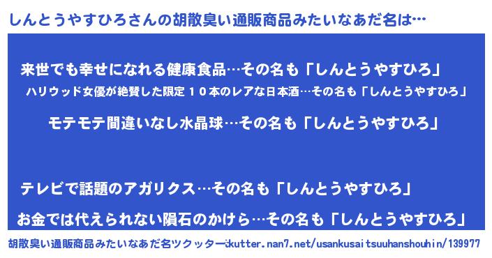 | 男性向けラノベタイトル風あだ名 | 『しんとうやすひろの憂鬱』 |