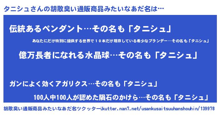 | ヒーロー風カッコイイあだ名 | 『スーパータニシュ』『天弓騎士タニ』 |