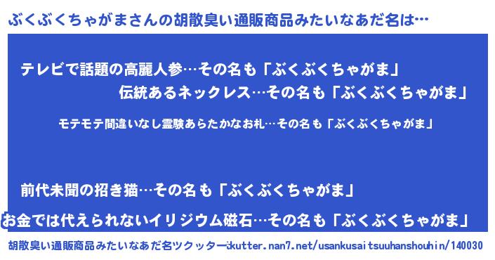 | 男性向けラノベタイトル風あだ名 | 『転生したらぶくぶくちゃがまだった件』 |