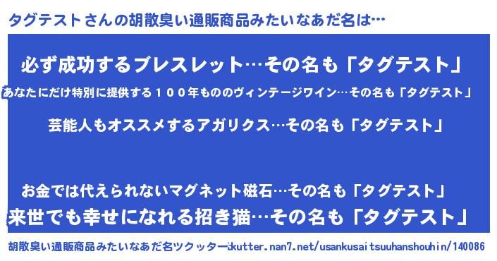 | 意味不明あだ名 | 『自称タグテスト』『ペロリンタグテスト』 |