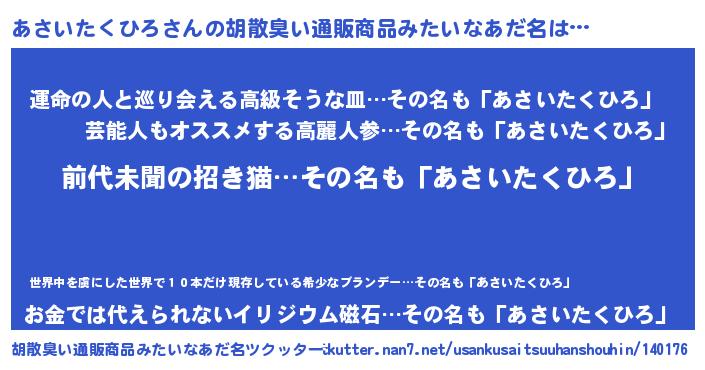 | 意味不明あだ名 | 『永久保存あさいたくひろ』 |
