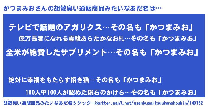 | 男性向けラノベタイトル風あだ名 | 『かつまみおの嫁は女の子じゃないと思った?』 |
