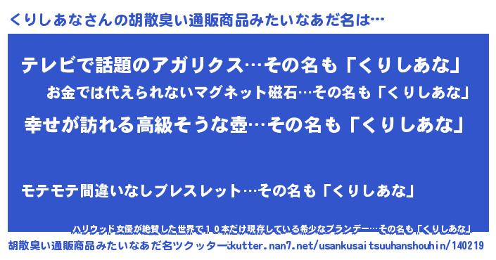 | 肩書あだ名 | 『くりしあな大統領』『くりしあな閣下』 |