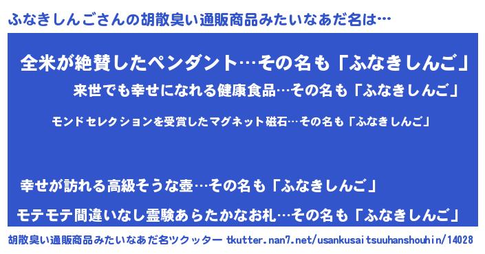 | 男性向けラノベタイトル風あだ名 | 『ノーゲーム・ノーフナキシンゴ』 |