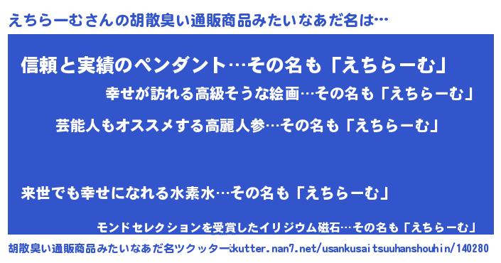 | 意味不明あだ名 | 『自称えちらーむ』『永久保存えちらーむ』 |