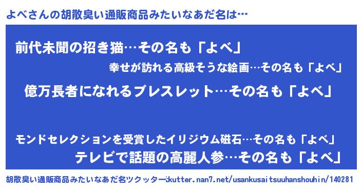 | 男性向けラノベタイトル風あだ名 | 『ヨベアートオンライン』『緋弾のヨベ』 |