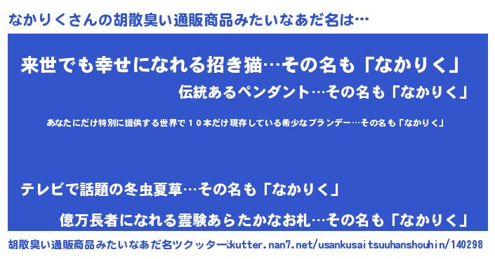 | 意味不明あだ名 | 『住所不定無職なかりく(71歳)』 |