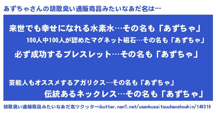 | 男性向けラノベタイトル風あだ名 | 『あずちゃの憂鬱』『緋弾のアズチャ』 |