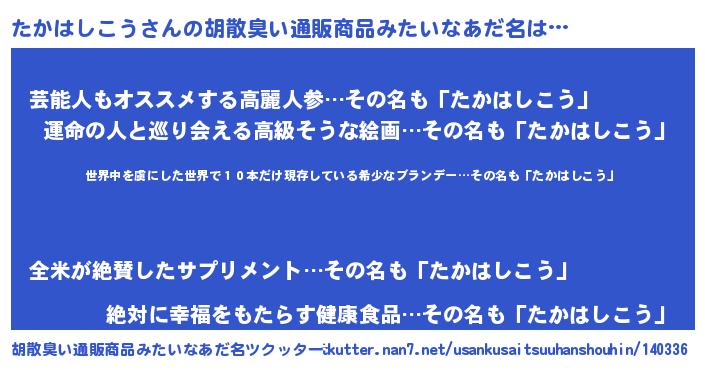 | 男性向けラノベタイトル風あだ名 | 『転生したらたかはしこうだった件』 |