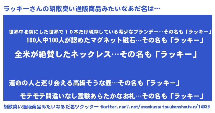 | 男性向けラノベタイトル風あだ名 | 『ラッキー~年齢イコール彼女いない歴の魔法使い~』 |
