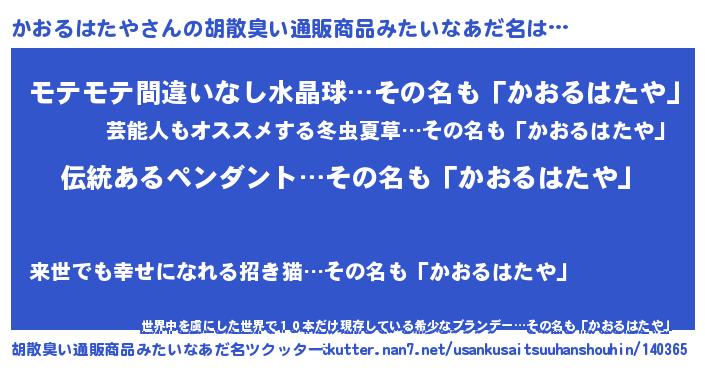 | 女子向けラノベタイトル風あだ名 | 『かおるはたやの卵を拾いまして』 |