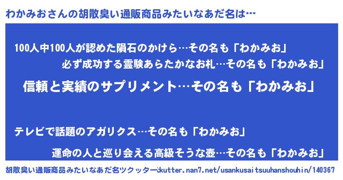 | 意味不明あだ名 | 『とにかく怪しいわかみお』 |