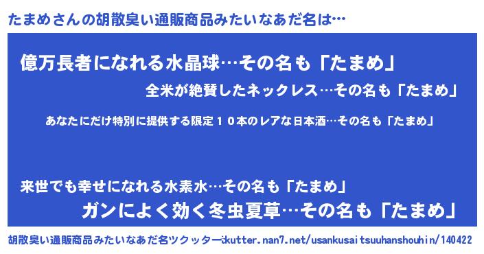 | 意味不明あだ名 | 『住所不定無職たまめ(40歳)』『自称たまめ』 |