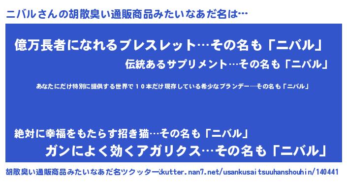 | 男性向けラノベタイトル風あだ名 | 『ニバルに滅ぼされるだけの簡単なお仕事です』 |