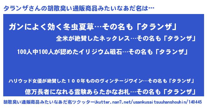 | 男性向けラノベタイトル風あだ名 | 『おまえをオタクにしてやるから、俺をタランザにしてくれ! 』 |