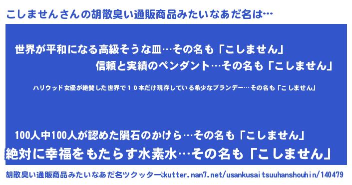 | 意味不明あだ名 | 『住所不定無職こしません(93歳)』 |