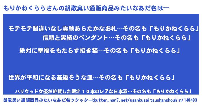 | 男性向けラノベタイトル風あだ名 | 『もりかねくららという概念が存在しない退屈な世界 』 |