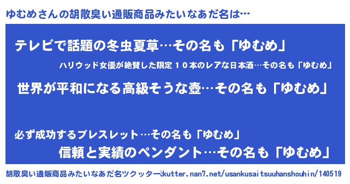 | 意味不明あだ名 | 『ゆむめフォーエバー』『自称ゆむめ』 |