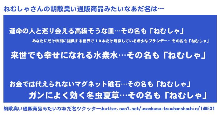 | ヒーロー風カッコイイあだ名 | 『ネオネムシャ』『ウルトラねむしゃマン』 |