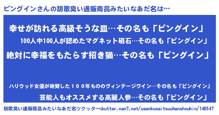 | 男性向けラノベタイトル風あだ名 | 『ピングインスレイヤー』 |