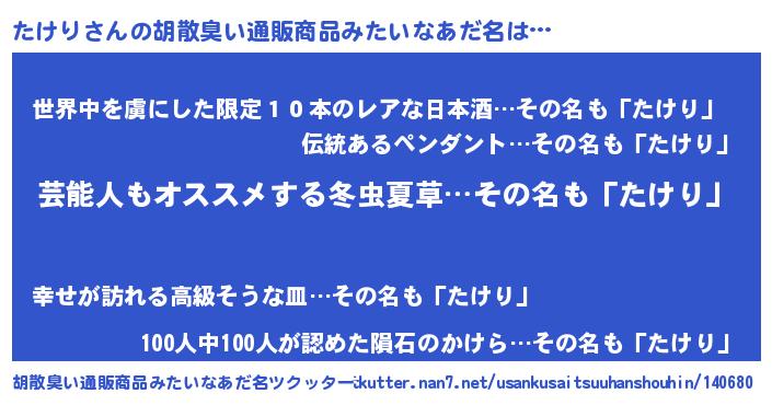 | 意味不明あだ名 | 『自称たけり』『住所不定無職たけり(40歳)』 |