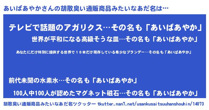 | 意味不明あだ名 | 『ヨモギ科あいばあやか属』 |