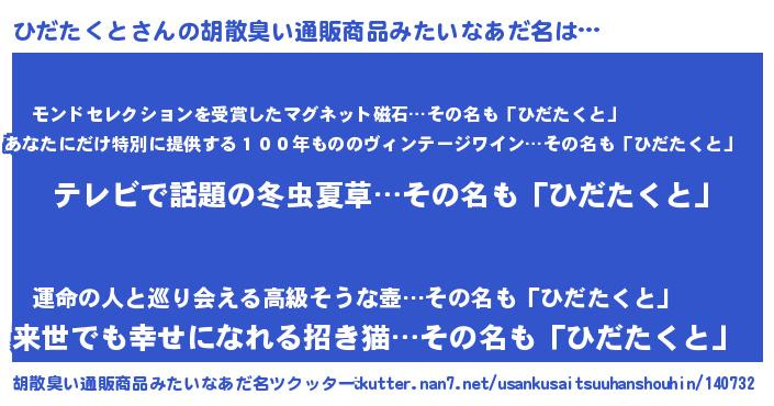 | 肩書あだ名 | 『ひだたくと総統』『ひだたくと教授』 |