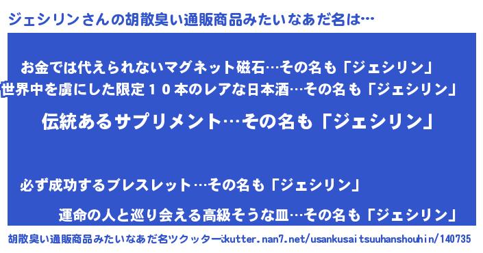 | 男性向けラノベタイトル風あだ名 | 『転生したらジェシリンだった件』 |