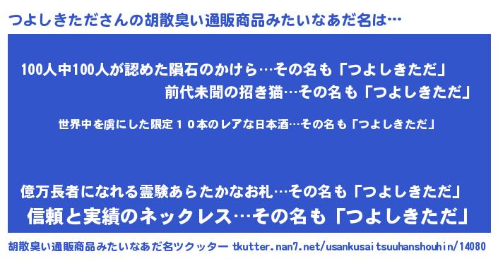 | 意味不明あだ名 | 『住所不定無職つよしきただ(59歳)』 |