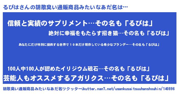| 意味不明あだ名 | 『住所不定無職るぴは(74歳)』『自称るぴは』 |