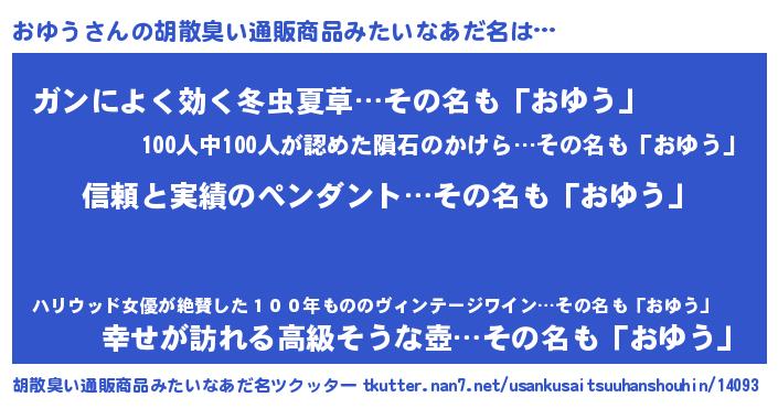 | ヘコむあだ名 | 『おゆぷりん』『牛乳』『おゆう(笑)』 |