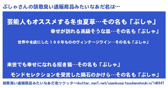 | 男性向けラノベタイトル風あだ名 | 『転生したらぷしゃだった件』 |