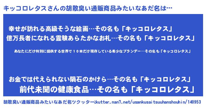 | 男性向けラノベタイトル風あだ名 | 『この素晴らしい世界にキッコロレタスを!』 |